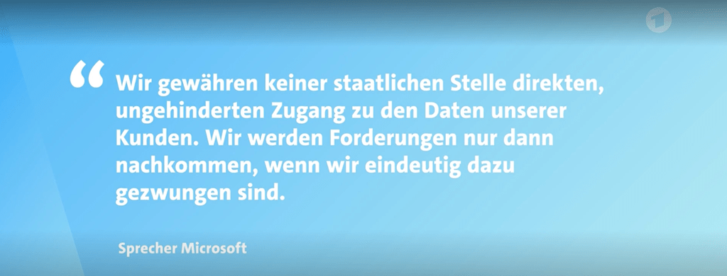 Europäisches Personal hin. Standort in Europa her, Präsident Trump und das US-Government haben trotzdem durch den Cloud Act und Executive Orders des Präsidenten das Recht, Zugriff auf die Daten zu fordern, ja zu erzwingen. Dies wurde gerade auch durch einen Microsoft-Sprecher bestätigt. Hier das entsprechende Zitat aus einem sehenswerten Beitrag des ARD Mittagsmagazins zum Thema digitale Souveränität (ab Minute 27:22), u.a. mit der IT-Dezernentin Laura Sophie Dornheim der Stadt München. Laut ARD wurde vom Pressesprecher von Microsoft folgendes Statement abgegeben.