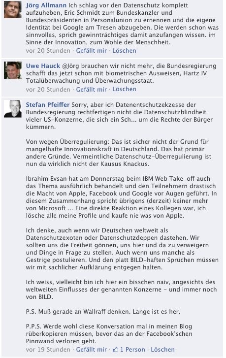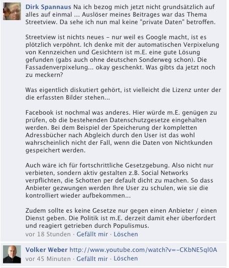 Dieser Tage habe ich den Bericht „Datenschutz: Hunderttausende erheben Widerspruch gegen Street View“ der Financial Times gezwitschert und auf Facebook gepostet. Daraufhin hat sich eine Diskussion entwickelt, die ich mit Einverständnis der 3 Beteiligten zwecks Dokumentation hier mal rüberkopiere. Es passt auch zur Diskussion, die wir auf dem IBM Web Take-off angefacht durch den Vortrag von Ibrahim Evsan geführt haben: