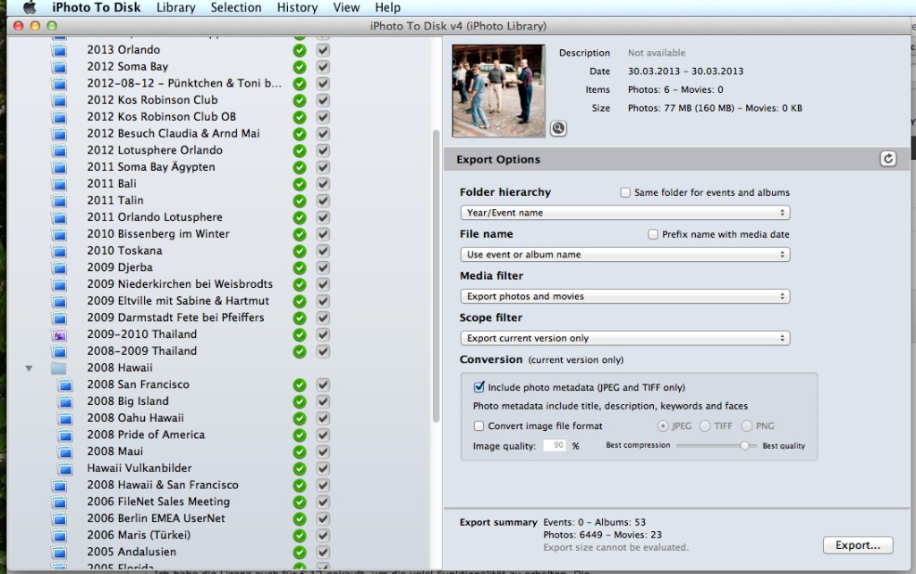 trotzdem habe ich ein ungutes Gefühl, denn iPhoto legt ja eine kryptische Datenbank- und Pfadstruktur an, wo man im Zweifelsfall mit dem Finder (Datei Manager) eher weniger etwas findet. Deshalb habe ich im Netz recherchiert und bin auf iPhoto to Disc gestossen. Mit iPhoto kann ich Ereignisse und Alben aus iPhoto auf externe Festplatten – in meinem Fall eine Western Digital MyBook Live mit 2 TB Speicherplatz – exportieren.