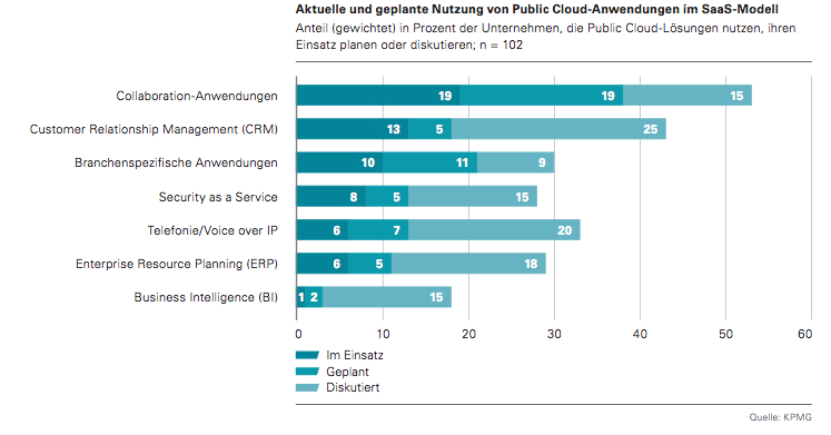 The „Cloud Monitor 2013“ shows where solutions are used in a Public Cloud Dark blue represents in use, middle blue planned and light blue in discussion.
