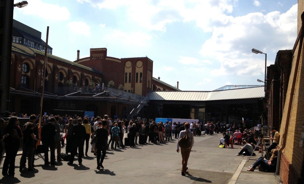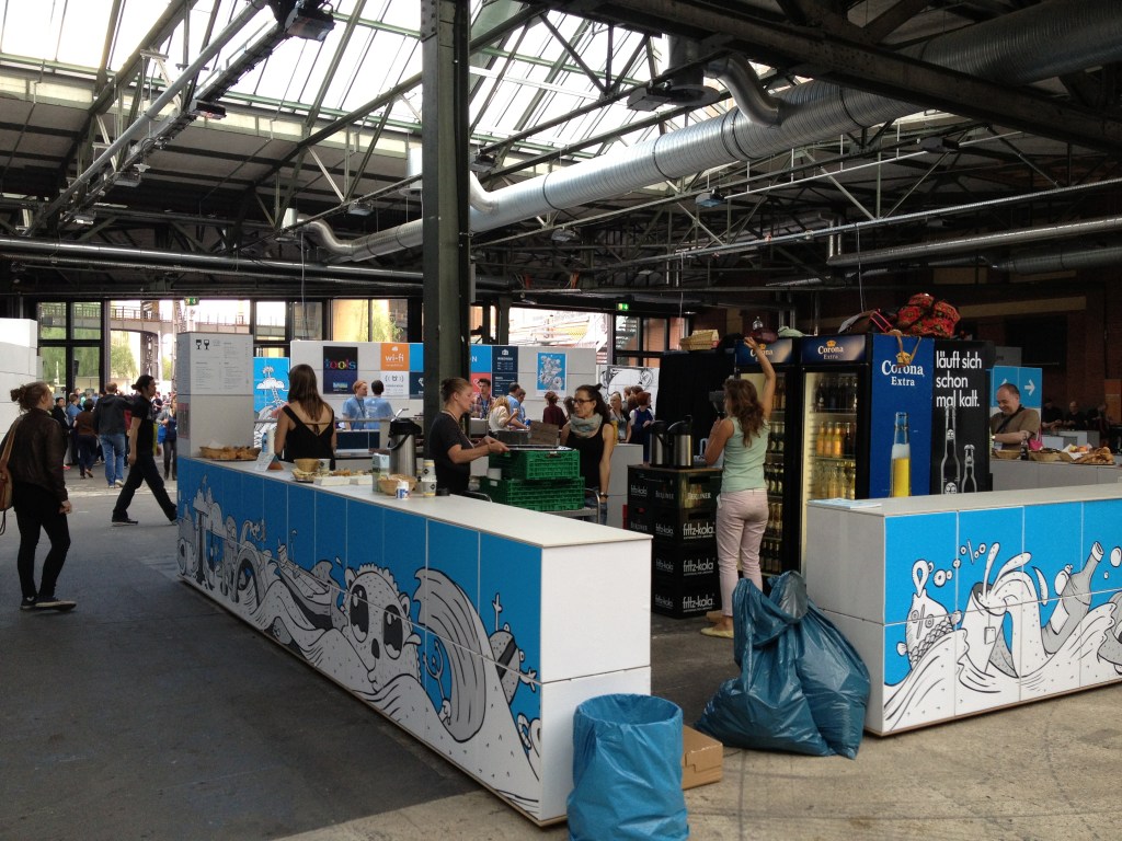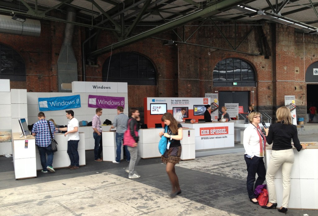 Und der zweite Grund war, meinen beiden Kollegen das besondere Flair der re:publica zu vermitteln. Willms Buhse hat das Buch Anzugsträger trifft Kapuzenpulli (oder so) geschrieben. Das trifft eigentlich ganz gut die Erfahrung der Kollegen. Die re:publica ist anders. Zitat: „Hier sind die Leute auf jeden Fall gerne da“ – was man bestimmt nicht von jeder Konferenz sagen kann. Kirchentag – das optische Setup hat wirklich was davon – oder Hambacher Fest (Dazu fehlt noch a bisserl der Einfluss.)? Es ist nicht das gewohnte Event, wie man es aus dem Business-Umfeld kennt. Es ist auch unterdessen mehr als nur noch ein Treffen der deutschen Blogosphäre. Es ist kein Event, wo man Top-Entscheidungsträger trifft. Es ist aber ein Event, wo man viele trifft, die auch in Unternehmen Social Media- und Social Business-Entscheidungen mit beeinflussen. Es ist keine Veranstaltung, wo man klassisch Werbe- und Produktvorträge halten kann. Dafür ist die Szene viel zu sensibel gegenüber Berieselung. Demzufolge: Es ist kein Event, wo man klassisch als Unternehmen Leads schreibt. Es ist aber ein Event, wo man auch als Unternehmen im B2B-Bereich Interesse wecken kann, Meinung bilden kann, wenn man authentisch und ehrlich ist, interessante Themen hat und Diskussion will – auch durchaus mal kontrovers.