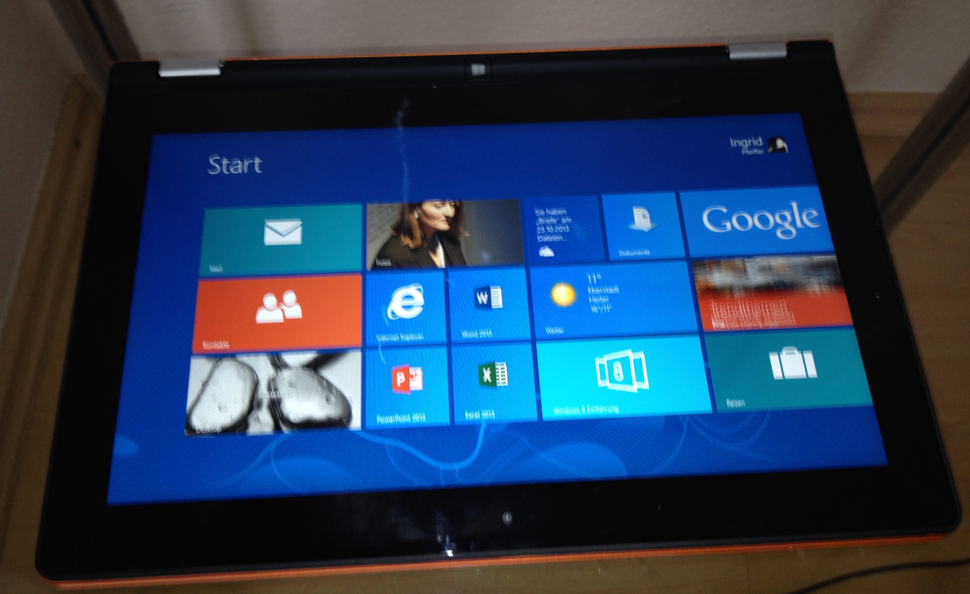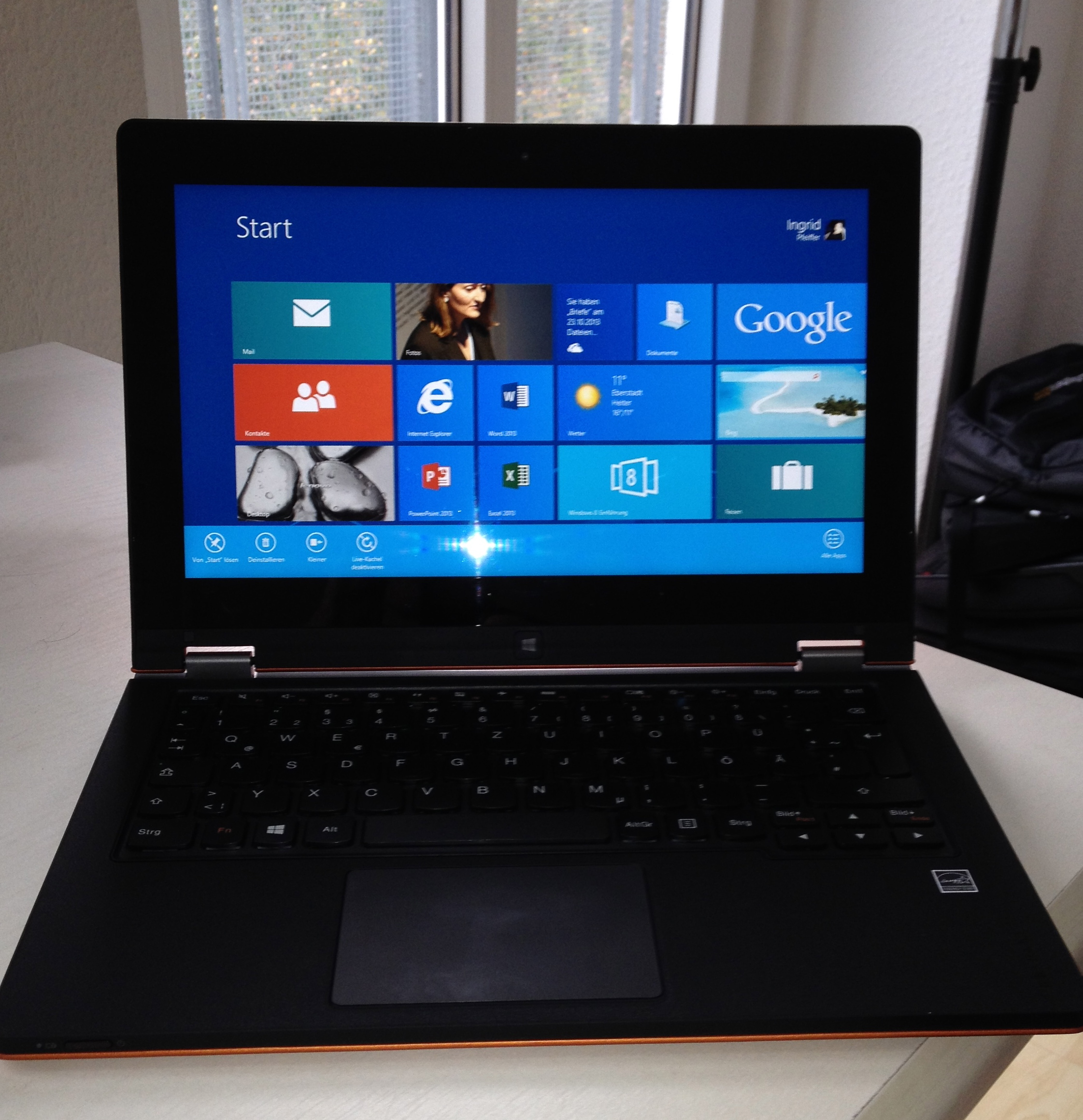 Nun hat meine Frau also einen Convertible Touchpad-PC auch für unterwegs. Ich bin auf die weitere Akzeptanz gespannt. Das – unterdessen wohl eingestellte – Gerät macht einen sehr wertigen Eindruck. Gehäuse und Tastatur fühlen sich angenehm an und haben nicht den mir sehr bekannten schwarzen Lenovo-Stabilo-Plastik–Look. Das Gerät war beim Konfigurieren sehr angenehm zu bedienen. Auch mit Windows RT 8.0 kam ich sehr schnell zurecht, obwohl ich nun seit einigen Jahren ein Apple-ianer bin.