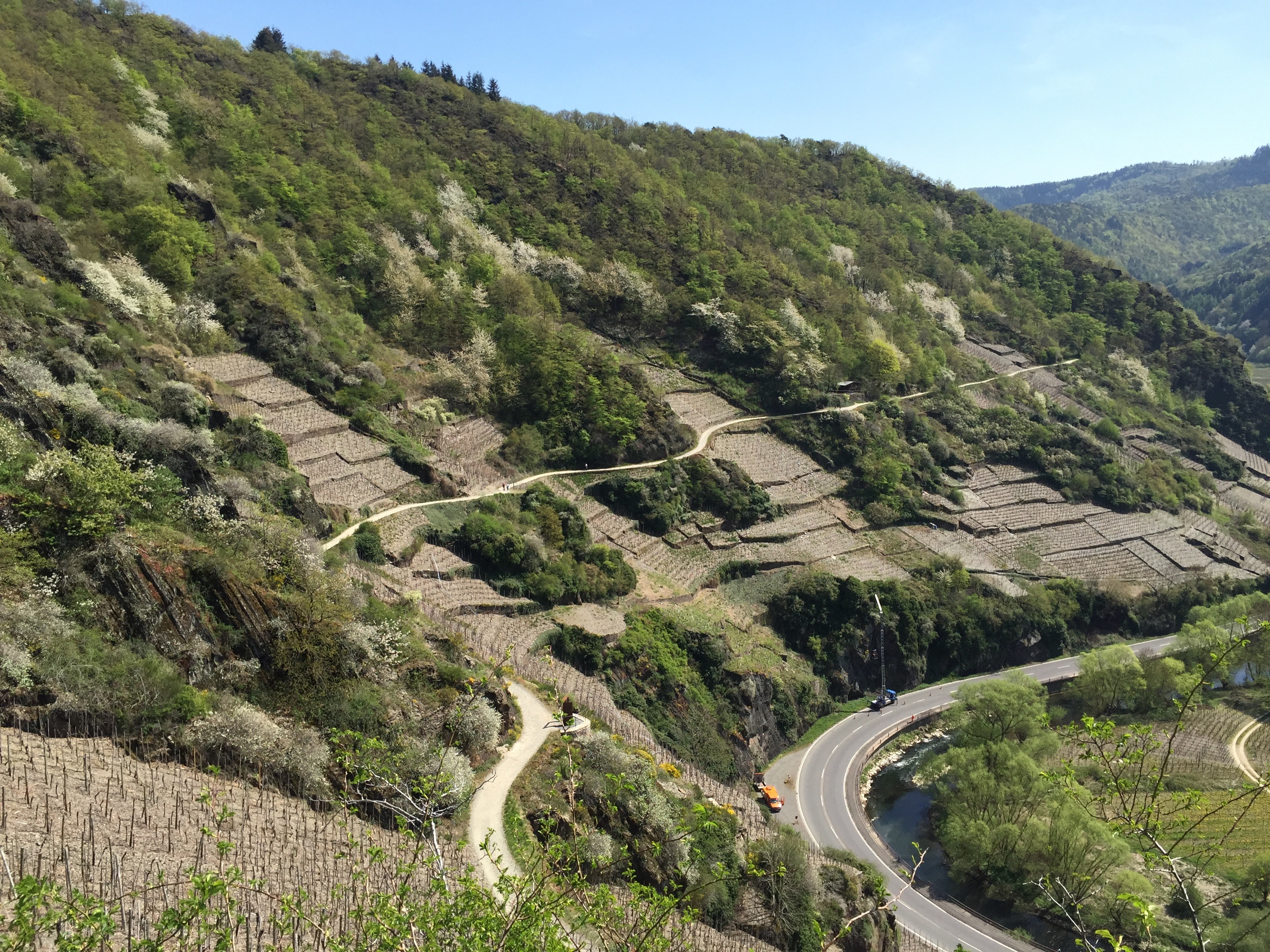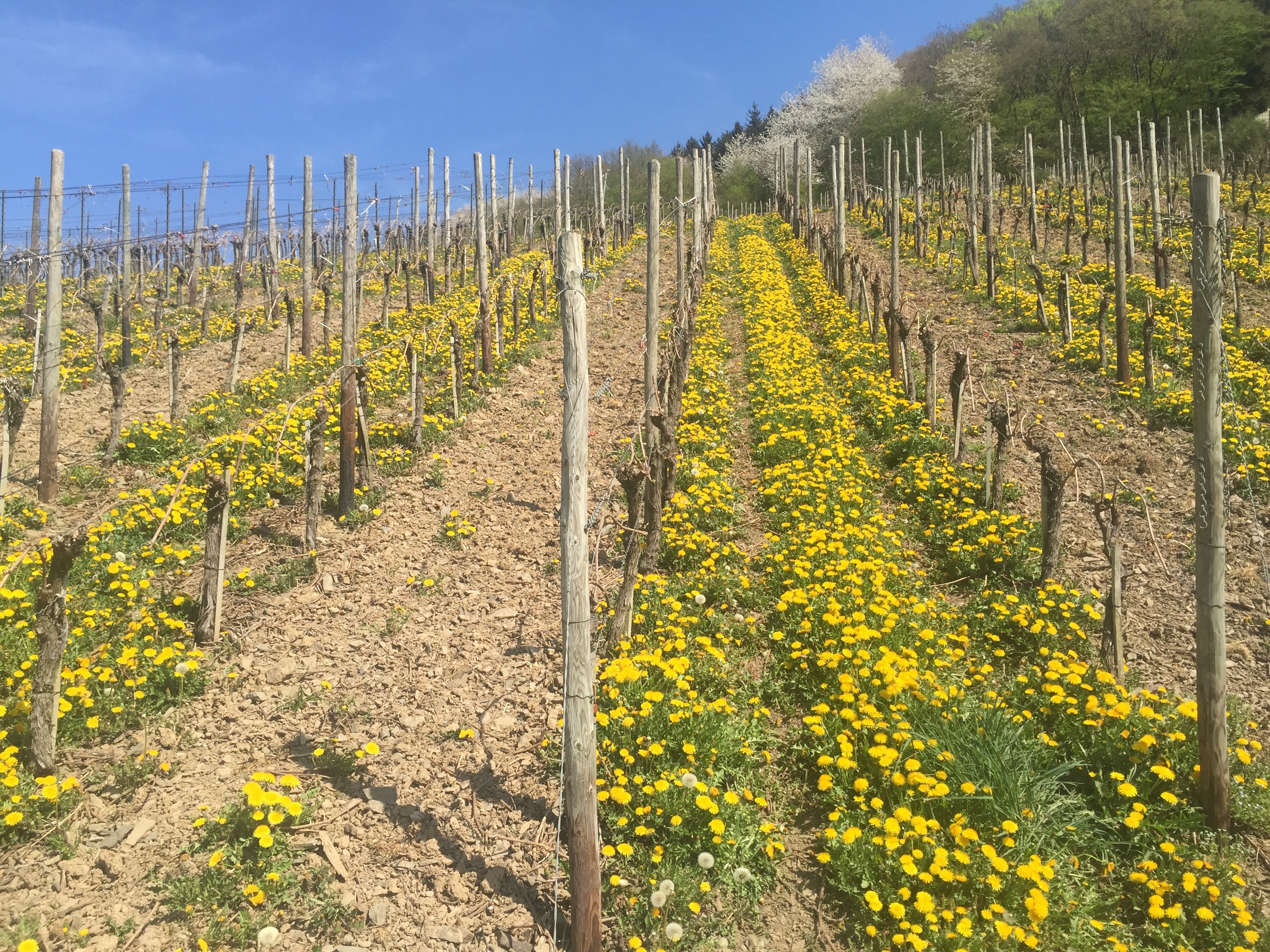 Apropos, am Samstag wollten wir danach den Dernauer Weinfrühling auf dem Rotweinwanderweg geniessen und durch die Weinberge marschieren. Haben wir dann auch trotz des nicht idealen Wetters getan. Und ich habe mich schon beim Lesen des Flyers auf Station #1, das Weingut Heiner & Kreuzberg, gefreut. Dumm gelaufen. Hier wurde aus welchen Gründen auch immer gewechselt. Das Weingut Kriechel kredenzte seinen Wein, ich zog ein wenig eine Flutsche, genoss aber die geräucherte Forelle. Wir sind dann weiter bis zum Kloster Marienthal gewandert, ein selten idyllischer Ort, wo wir Flammkuchen genossen.