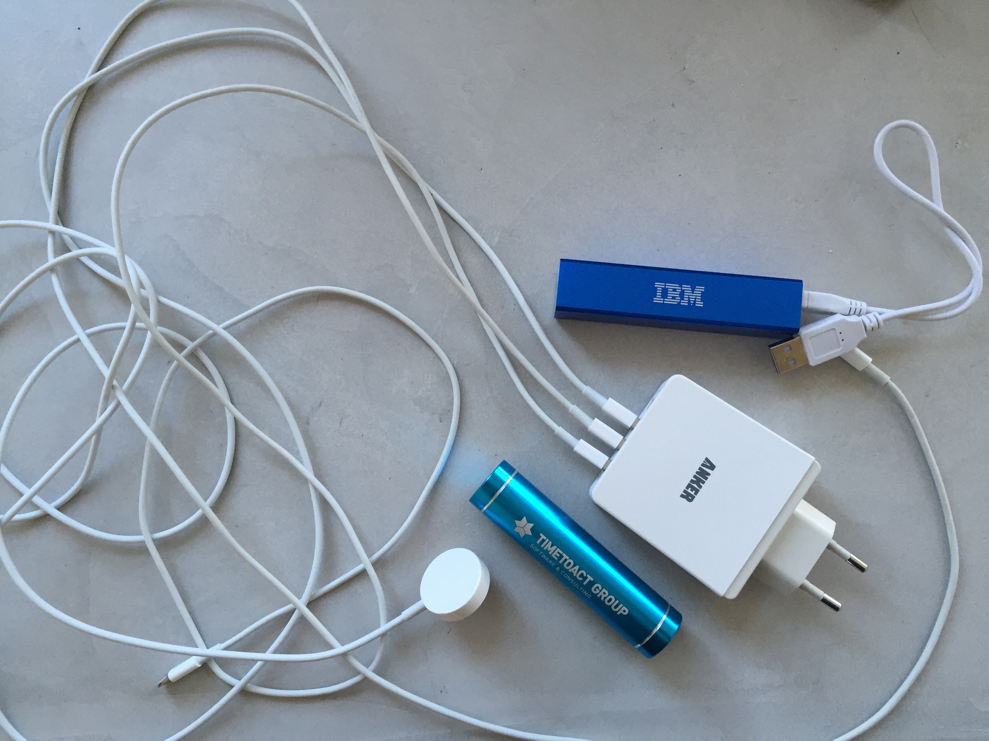Tja, es ist schon eine Gerätezoo, den ich zur IBM Connect mitnehme: iPhone, iPad, Plantronics-Headset, zwei USB Charger, Apple Watch und MacBook. Wofür ich iPhone, iPad und MacBook nutze, dazu morgen mehr. Aber alle Geräte müssen geladen und einsatzbereit sein. Die Konsequenz: ein richtiger Kabelsalat, den ich etwas mit dem Anker USB Hub zu bändigen suche. Und natürlich fehlt auf dem Bild der Adapter für Ami-Steckerei. Und ja, die Innovation, der ich wirklich entgegen fiebere, ist das kabellose Laden all dieser Geräte.