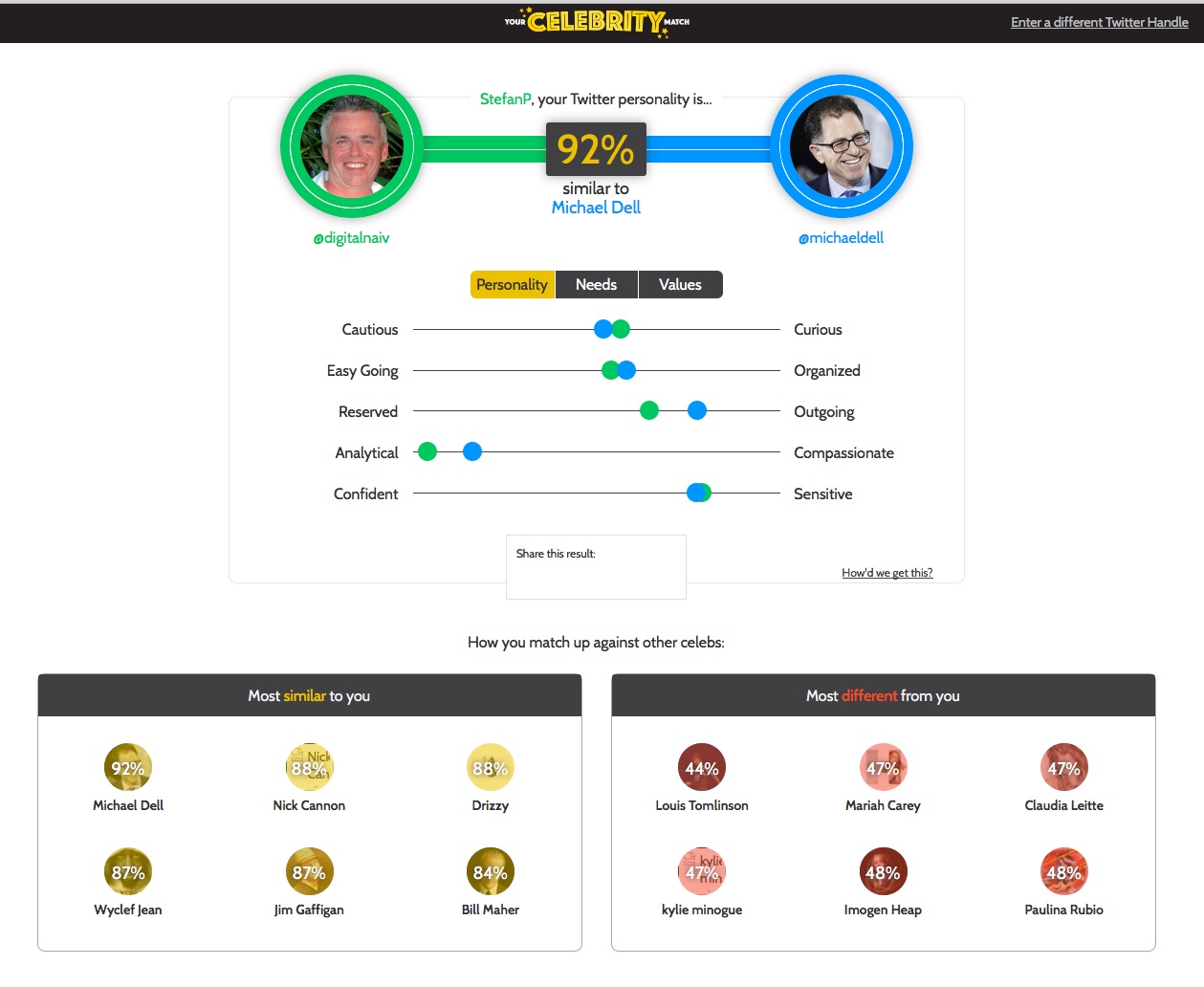 Wer selbst einmal einen ersten Eindruck gewinnen will, kann sich hier einmal auf Grund seiner Tweets mit bekannten Persönlichkeiten vergleichen lassen. Meine Twitter-Persönlichkeit ist demzufolge der von Michael Dell sehr ähnlich.
