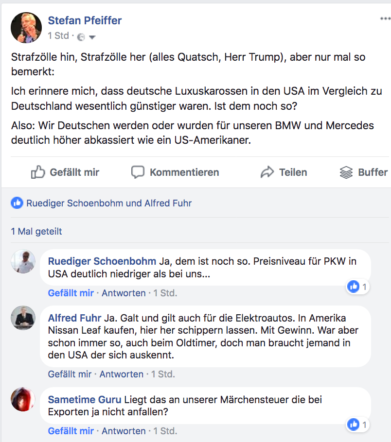 Die Diskussion um potentielle Strafzölle auf deutsche Autos: Strafzölle hin, Strafzölle her (alles Quatsch, Herr Trump), aber nur mal so bemerkt: Ich erinnere mich, dass deutsche Luxuskarossen in den USA im Vergleich zu Deutschland wesentlich günstiger waren. Ist dem noch so? [Wurde mir unterdessen auf Facebook von verschiedenen Seiten bestätigt, dass dem noch so ist.]
