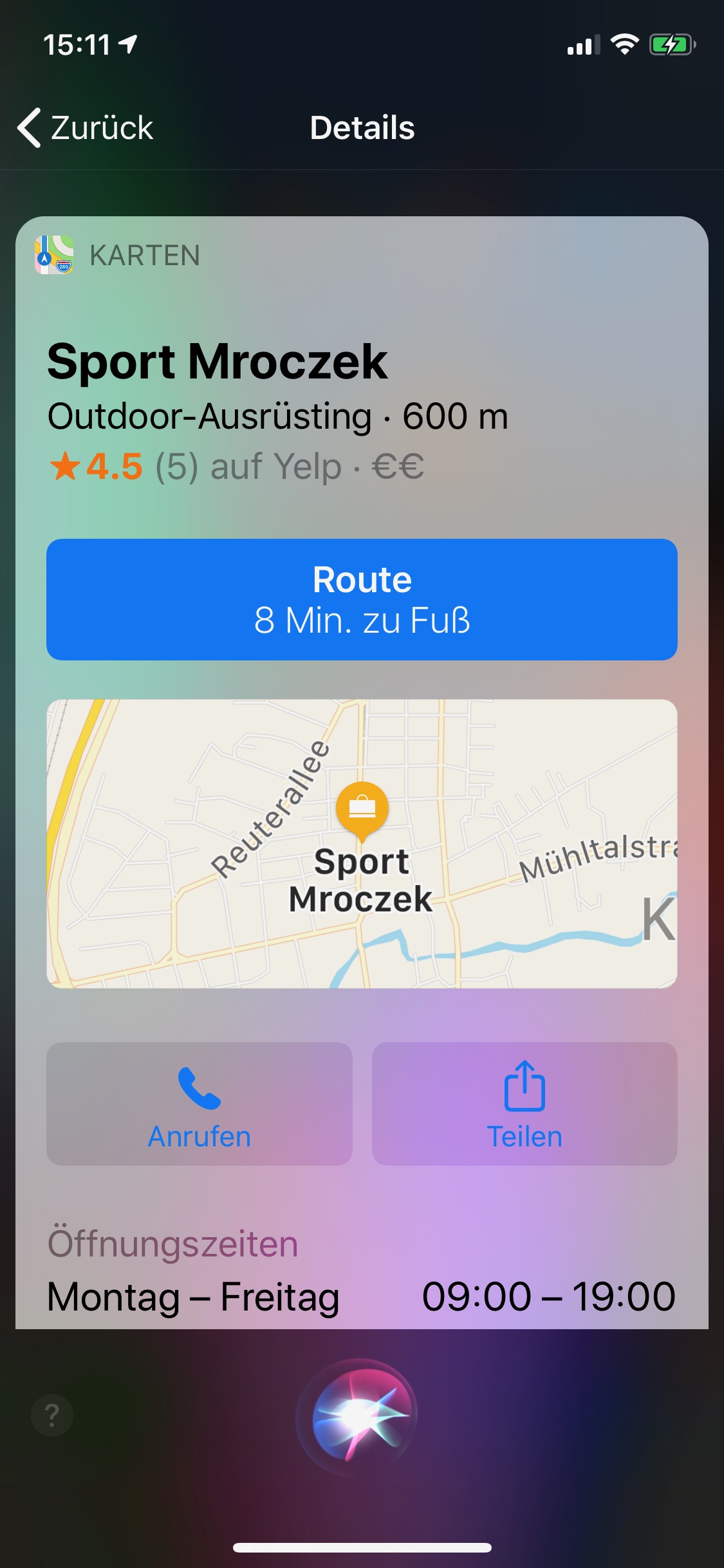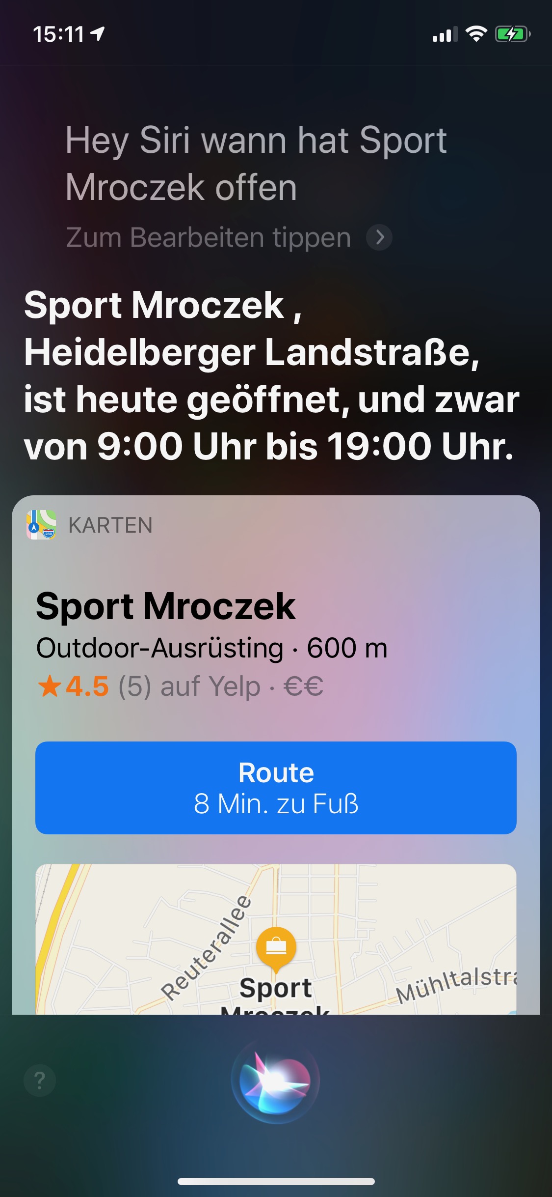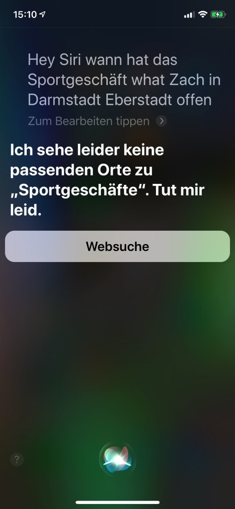 Kurz zusammengefasst: Früher sagte ich, meine Frau versteht mich nicht. Siri versteht mich wirklich noch nicht. Es war mühselig. Gut, der Name des Geschäfts ist kompliziert. Und ja, ich habe sicher nicht die Logik verwendet, wie man Siri am besten befragt. Aber egal: Sprache als Interface muss so funktionieren und akzeptiert werden, wie ich sie spreche. Hier einige Ergebnisse und Versuche: