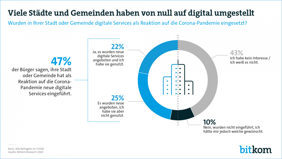 Das Bild ist auch laut einer repräsentativen Umfrage im Auftrag des Digitalverbands Bitkom unter mehr als 1.000 Personen ab 18 Jahren in Deutschland zwiegespalten. Demnach haben etwa die Hälfte aller Städte und Gemeinden nach Meinung der Befragten neue digitale Services eingeführt, doch nur etwa jeder Fünfte hat solche Möglichkeiten genutzt. Ob das wirklich eine Umstellung von null auf digital ist?