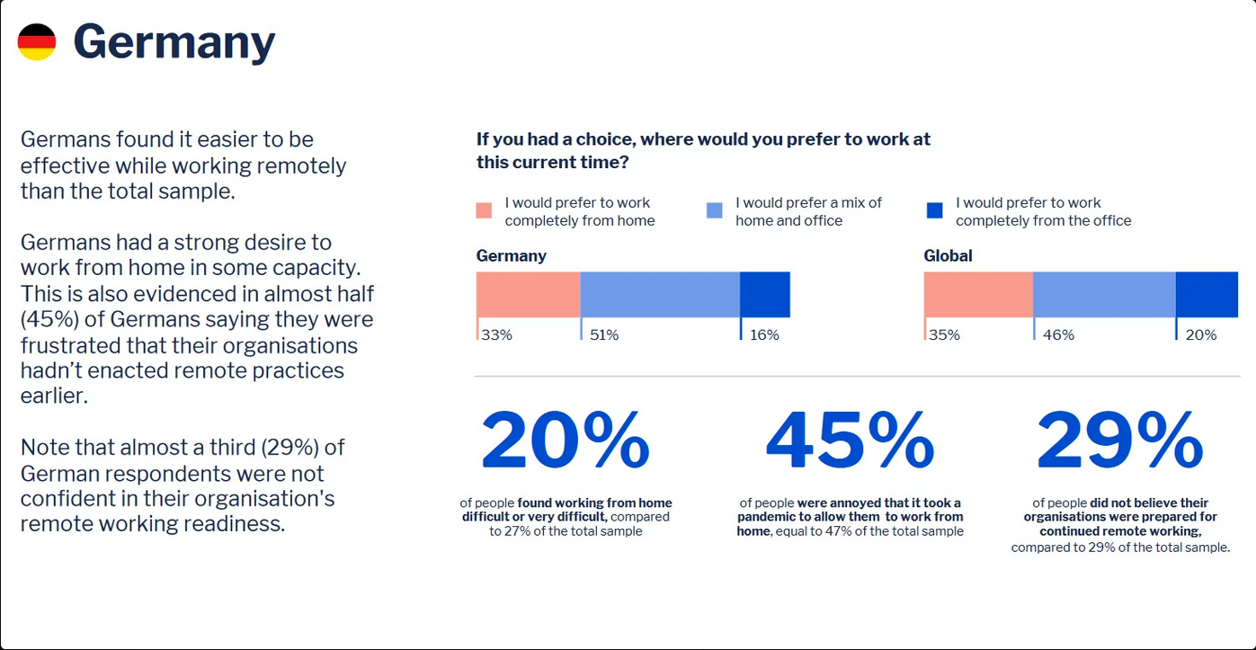 Ach ja, noch eine entsprechend Aussage, die in der Pressemitteilung zitiert werden muss: „Jeder Dritte (32 Prozent) meint, Kollegen im Homeoffice würden weniger arbeiten, …“ Da gibt es Studien – und nicht nur Meinungsäußerungen -, die das genau das Gegenteil belegen. Eine Analyse von Atlassian, Anbieter von Kollaborationslösungen, unter Anwender:innen dieser Werkzeuge zeigt, dass quer über alle Länder die Mitarbeiter:innen mehr arbeiten. In Deutschland – so die Analyse – wird demnach im Schnitt 30 Minuten länger gearbeitet. Man fängt 15 Minuten früher an und hört demnach 14 Minuten später auf.