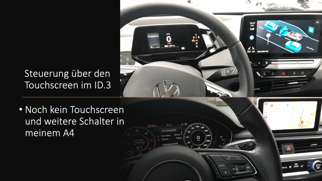 Der ID.3 und mein jetziger A4 haben dann noch einen Bildschirm für Navigationssystem, Radio und all die anderen netten Funktionen, die unterdessen in modernen Fahrzeugen verbaut sind. In meinem A4 ist das noch kein Touchscreen und es gibt noch viele Schalter, um beispielsweise Sitzheizung, Klimaanlage und andere Module zu steuern. Im ID.3 geschieht all das über den Touchscreen.