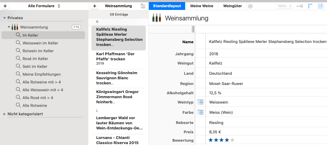 Also bin ich nach einer Recherche im Netz testweise auf Tap Forms Mac 5 umgestiegen und habe basierend auf einer vorhandenen Beispielvorlage meine Datenbank und mein Formular zur Verwaltung von Weinen gebaut. Die Struktur orientiert sich logischerweise an den alten Vinoteka-Daten, die ich importiert habe. Insgesamt habe ich aber vieles vereinfacht. Sieht nicht so schön und bunt aus wie bei Vinoteka (siehe Screenshot unten), aber tut es.