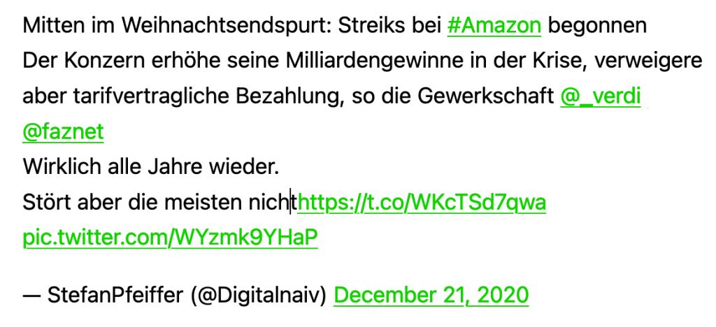 Alle Jahre wieder streiken die Amazon-Mitarbeiter in deutschen Lieferzentren. Gabor Steingart, den ich heute ausnahmsweise einmal wieder zitieren muss, schreibt von „archaischen Arbeitsbedingungen“ und saloppem Umgang mit Daten. So sollen Daten der unabhängigen Händler analysiert und benutzt werden, um die Amazon-eigenen Angebote zu optimieren. Hinzu kommt wohl eine minutengenaue Überwachung der Mitarbeiter. Und bei all dem sprudeln die Gewinne. Amazon ist ganz sicher einer, wenn nicht der Krisen-Gewinnler.