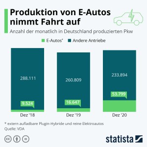 Und noch einige Statistiken: Laut VDA nimmt die Produktion von E-Autos Fahrt auf. Jedes fünfte Auto, das im Dezember in Deutschland vom Band gelaufen ist, sei ein E-Auto gewesen.