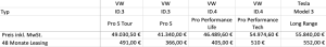 Hier der Preisvergleich der konfigurierten Fahrzeuge, jeweils kalkuliert auf 15.00 Kilometer Fahrleistung im Jahr, 48 Monate, 6.000 bis 6.500 Euro (Tesla) Anzahlung, was der staatlichen Förderung für E-Autos entspricht: