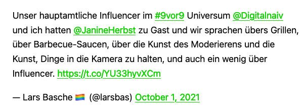 Der neue Job kostet Zeit und Kraft. Deshalb ist es im Blog etwas ruhiger und #9vor9 musste in der Kalenderwoche 39 ausnahmsweise auf einen Donnerstag verschoben werden. Wir werden jetzt wieder versuchen, Dienstags zu senden in der neuen Zeit um 8:30 Uhr bis maximal 8:51 Uhr, eben 9 vor 9. Am Donnerstag hatten einen charmanten Gast: Janine Herbst von Archetype war da und es ging um das Thema Influencer.
