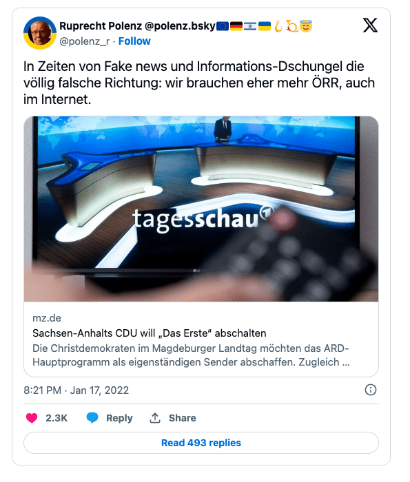 Nun verwischen die Kanäle generell immer weiter. Auch die FAZ produziert Audio, sprich Podcasts, und auch Video.Umgedreht schreiben die ARD-Anstalten und das ZDF auch Texte, veröffentlichen sie auf Apps, Mediatheken und online. Dass manchem die Öffentlich-Rechtlichen ein Dorn im Auge sind, kann man auchdem Tweet und Bericht der Mitteldeutschen Zeitung entnehmen, nachdem die CDU aus Sachsen-Anhalt „Das Erste“ abschalten wolle. Ruprecht Polenz, ehemaliger CDU Generalsekretär und unterdessen großerer Twitterer, entgegnet, dass man die Öffentlich-Rechtlichen brauche, gerade auch im Internet.
