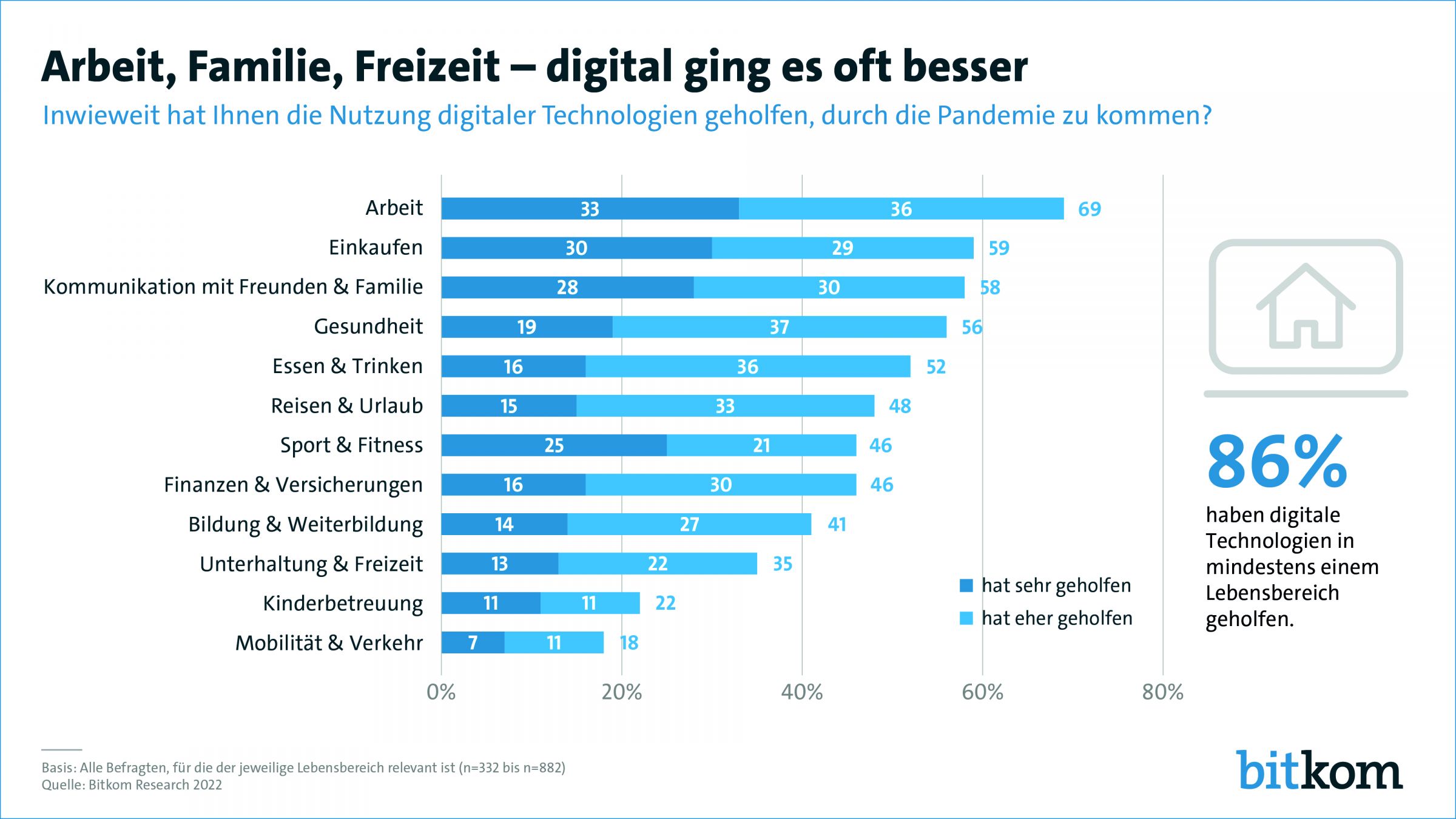 Insgesamt ist die Mehrheit der Befragten – 65 Prozent – der Meinung, dass digitale Technologien grundsätzlich dabei helfen, durch die Pandemie zu kommen. Allerdings wird das digitale Pandemiemanagement von Wirtschaft, Gesundheitswesen, Schulen und Verwaltung & Behörden auf der anderen Seite mit maximal Schulnote 3 „befriedigend“, bei Schulen und Verwaltung sogar mit 4 für „ausreichend“ bewertet. Ich gebe zu, dass meine Noten hier deutlich schlechter ausfallen würden.