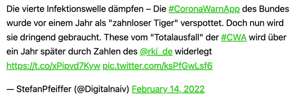 Und hier die Wochenschau für die Kalenderwoche 7/2022: Angesichts der Öffnungs- und Lockerungsorgien allenthalben fühle ich mich verpflichtet, doch ein, zwei Tropfen Essig in den Wein zu gießen. Dann noch ein Blick in die sozialen Medien und die Verantwortung der Anwenderinnen und Anwender. Und ein Blick in mein Homeoffice …