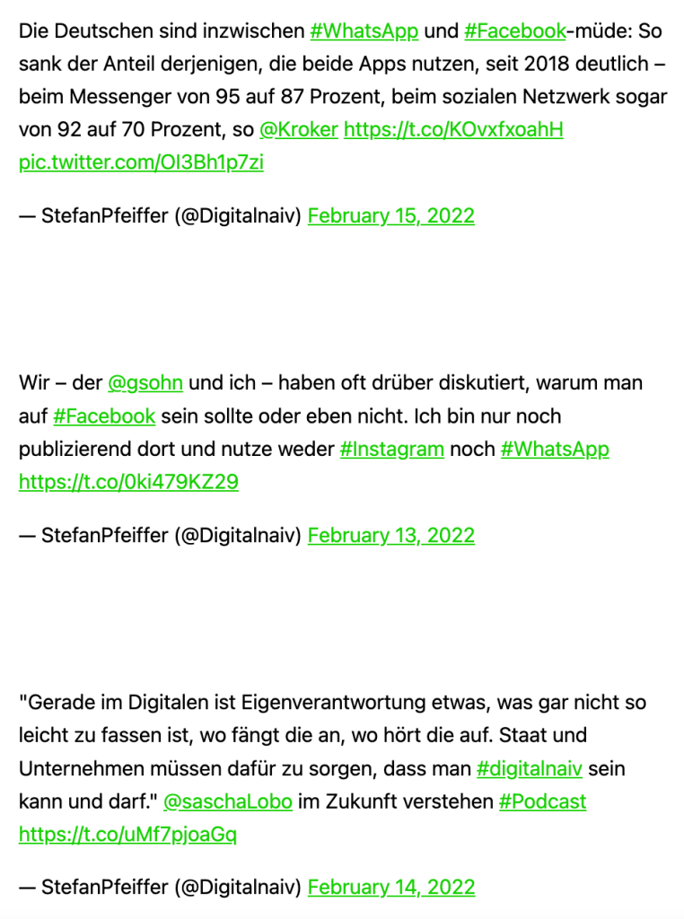 Und dann eine Meldung, die mich eigentlich freuen muss. Facebook und WhatsApp verlieren an Anwenderinnen und Anwender. Aber lassen wir die Kirche im Dorf: Es sind noch immer zu viele dort aktiv – und die ignorieren geflissentlich die Missgriffe von Facebook aka Meta. Da passt dann Gunars Artikel dazu, warum er noch auf Facebook ist – und ich seit Dezember 2018 weg bin. Und ebenso passend auch der Beitrag von Sascha Lobo, dass Anwenderinnen und Anwender gefälligst digital naiv sein dürfen – und Staat und Unternehmen sich doch gefälligst um sie kümmern sollen.