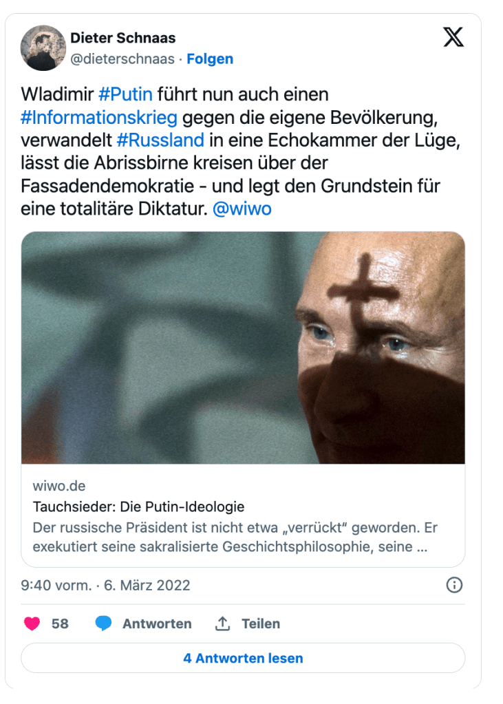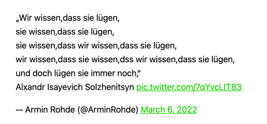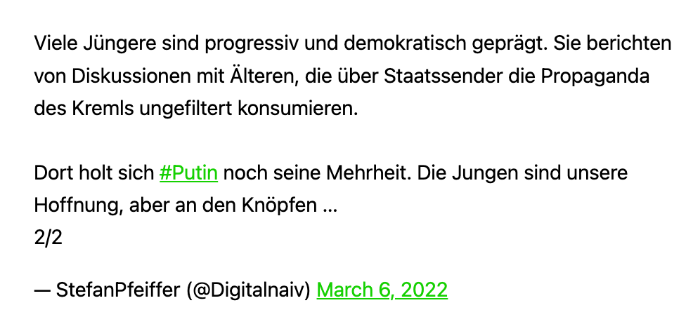Natürlich kommen wir alle am Thema Ukrainekrieg nicht vorbei. Ein kleine Auswahl an Artikeln von dieser Woche. Leider scheint Putin die Russinnen und Russen mit seiner Lügenproganda mehrheitlich im Griff zu haben, sogar bei den Russlanddeutschen.