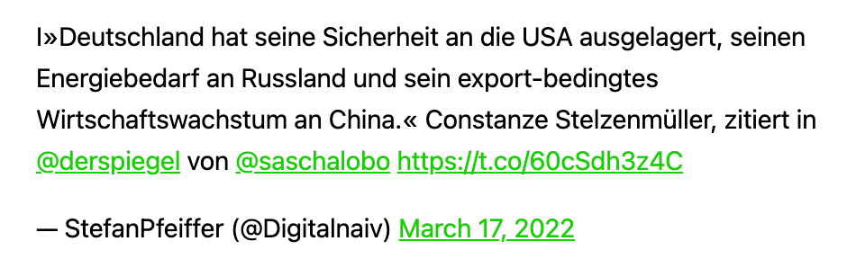 Bewusst verzichte ich auf Tweets zum Auftritt von Selenskyj vor dem deutschen Bundestag. Wie gesagt: Viel Scheinheiligkeit, Populismus und Wahlkampf darunter. Zur Lektüre sei dieser Beitrag der FAZ mit den Zitaten von Robert Habeck empfohlen. Ja, wir müssen so schnell wie möglich zu schärferen Maßnahmen kommen, aber ganz so einfach ist es halt nicht.