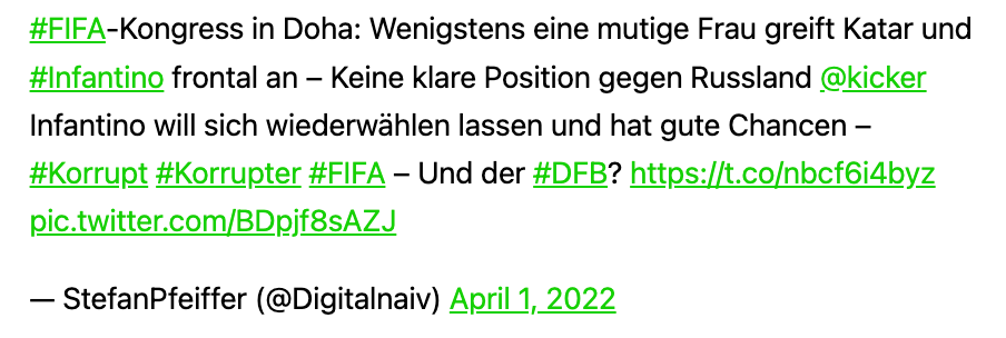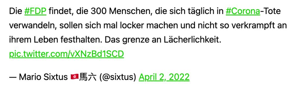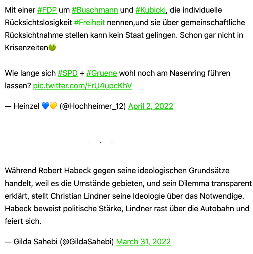 Dem Thema politische Kommunikation, die Art wie Habeck und beispielsweise Lindner gerade kommunizieren, werden sich Lars und ich am kommenden Dienstag, 5. April, um 8:51 Uhr widmen. Doch die FDP und ihre unsägliche, menschenverachtende Rolle gehört für mich in den Fokus dieses Wochenrückblicks. Menschen, die täglich durch Corona sterben, und Risikopatienten, die durch den Wegfall der Maskenpflicht viel stärker gefährdet werden, scheinen bei den sogenannten Liberalen nicht unbedingt oben auf der Agenda zu stehen. Kollateralschäden halt. Die FDP meint, dass man sich halt einfach locker machen solle. Da gehe ich dann lieber mit Dunya Hayali in die nächste Kneipe und haue mir einen hinter die Kiemen. Unsäglich, was SPD und Grüne sich bieten lassen, von Maskenpflicht bis Tempolimit.