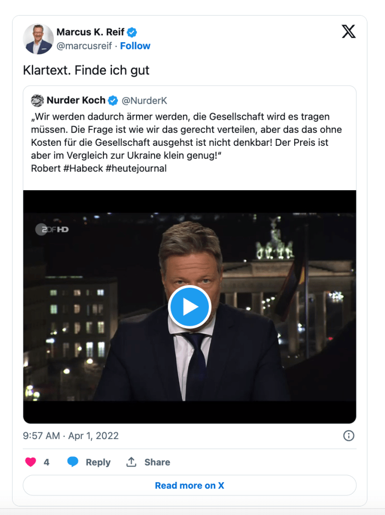 Kann man in der Politik auch anders, offener und transparenter kommunizieren? Das war am 5. April 2022 Thema von #9vor9. Und der Anlass – wie kann es in diesen Tagen anders sein -, sind die Äußerungen und Erklärversuche von Robert Habeck*, die sich nicht nur nach Meinung der Netzgemeinde wohltuend von den üblichen, genormten, parteikonformen Politikeraussagen links und rechts abheben. Es scheint zumindest so, dass Politik erklärt werden kann und oft gar nicht so komplex ist, wie es mancher Politiker dem Publikum vorgaukelt. In