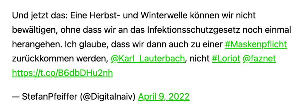 Diese klare Kante und Kommunikation möchte ich auch mal explizit als positive Nachricht der Woche hervorheben (und ich werde versuchen, jetzt immer auch mindestens eine positive Meldung zu veröffentlichen). In letzter Zeit, gerade auch vergangene Woche, hatte ich den Eindruck, dass ich nur negative Themen im Wochenrückblick zusammengefasst habe.