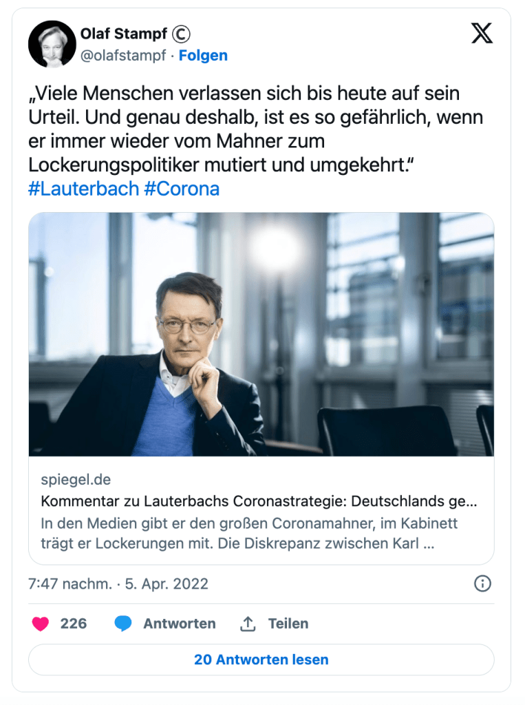 Zum Thema Lauterbach: Trauen ihm wirklich noch viele oder hatte er eben jenes Vertrauen wegen des Zickzack-Kurses endgültig verspielt: