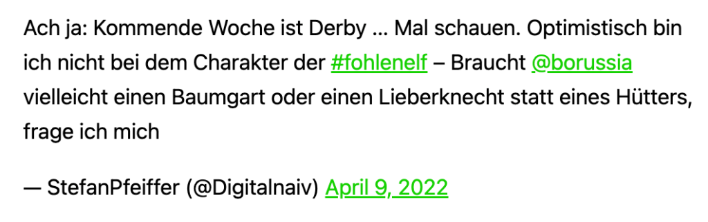 Ich bin bekennender Gladbach-Fan. Schon immer. Doch ein Fan der jetzigen Mannschaft bin ich nicht. Kein Charakter, keinen Willen. Und Adi Hütter hat – nachdem ich ihn lange verteidigt habe – deutlich an Kredit verloren. Kommende Woche ist Derby und ich gehe mit keinen positiven Gefühlen in dieses Spiel.