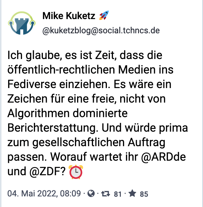 Ich glaube, es ist Zeit, dass die öffentlich-rechtlichen Medien ins Fediverse einziehen. Es wäre ein Zeichen für eine freie, nicht von Algorithmen dominierte Berichterstattung. Und würde prima zum gesellschaftlichen Auftrag passen. Worauf wartet ihr @ARDde und @ZDF?