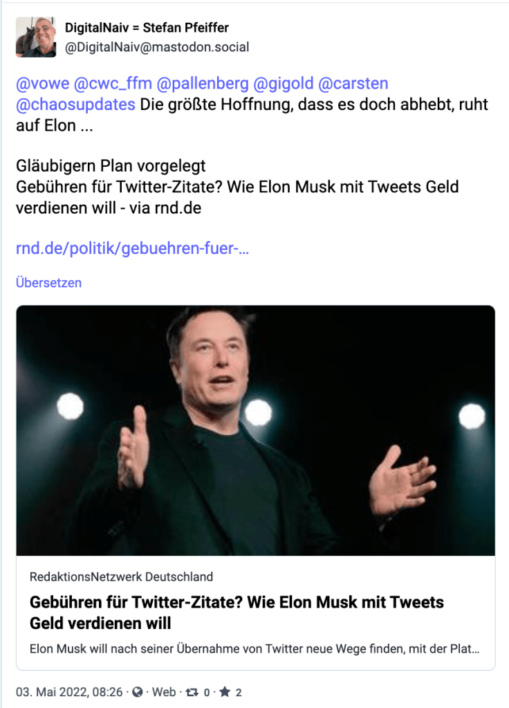 Der eine (ich) ist mitten drin, der andere (Lars Basche) ist nur dabei und schaut zu. Wir haben über den neuesten heißen Sch..ss, den #Twitter-„Nachfolger“ Mastodon gesprochen. Oder ist es mal wieder nur ein One Night Stand wie damals Clubhouse? Hier unser 12-minütiger Austausch zum Thema mit Rausschmeisser. Meine Kernaussage: Worauf beruht meine Hoffnung, dass Mastodon und das Fediverse doch abheben? Elon Musk baut richtig viel Mist auf Twitter!