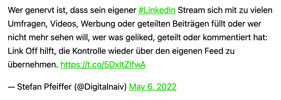 Passend wie die legendäre Faust aufs Auge der der Artikel, den Klaus Eck gezwitschert hat. Dort geht es unter anderem darum, wie man den Stream (= Feed = Timeline) in LinkedIn besser kontrollieren kann, beispielsweise die dort unterdessen mich immer mehr nervenden Werbebeiträge auszublenden. Auch die anderen empfohlenen Tools, die es alle für Chrome gibt, klingen interessant.