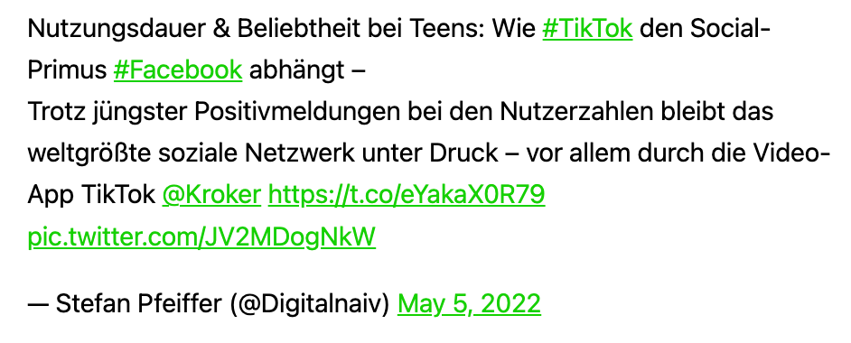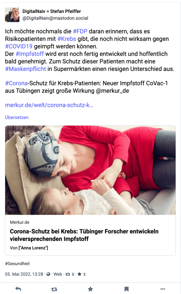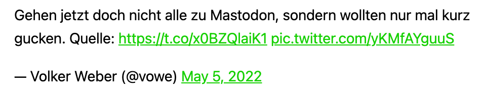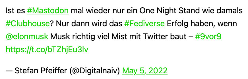 Ich bin weiter auf Mastodon und – wie Ihr sehr – verlinke auch Beiträge, die ich dort teile. Zwar bekomme ich auf Mastodon bei weitem nicht alle Informationen, die in meinem angepassten Feed auf Twitter einlaufen, aber viele Gespräche sind einfach „sozialer“. Ich bleibe erst einmal dort.