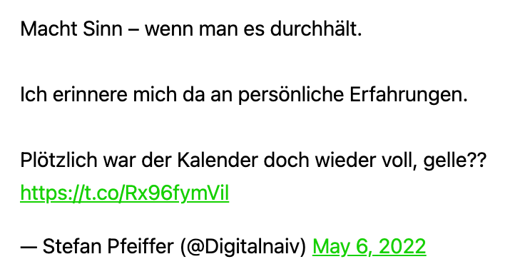 Und jetzt Themenwechsel. Mit Amüsement habe ich den Artikel über den Focus Friday gelesen. So ein Konzept habe ich auch mal erlebt. Keine Meetings am Freitag. Ihr glaubt nicht, wie schnell der Kalender mit Terminen, die natürlich keine Meetings waren, voll war.