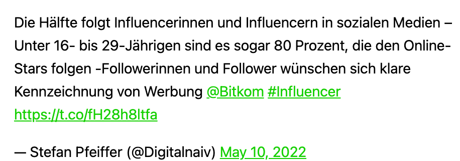 Unterdessen zucke ich beim Begriff Influencerinnen oder Influencer zusammen. Im kommerziellen Bereich dürften die Daten plausibel sein, doch im B2B-Umfeld oder bei Corporate Influencern würde ich andere Parameter bevorzugen. Da bin ich halt durch meine Branche und meinen Job geprägt.