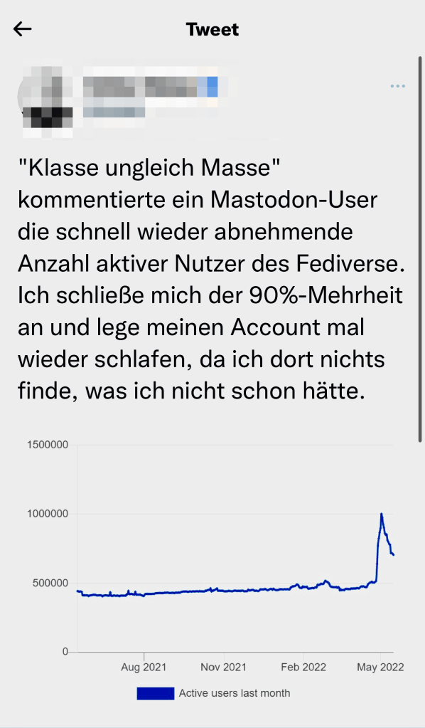 Viele haben es befürchtet und derzeit scheinen sie Recht zu haben: Der Zustrom von Nutzerinnen und Nutzern auf Mastodon ist eingeschlafen. Vor allem scheint die Nutzung wieder zurück zu gehen. Viele sind wieder zurück zu Twitter gegangen, weil ihnen der Mehrwert von Mastodon derzeit zu gering ist. Einige Switcher scheinen weiter aktiv zu bleiben: