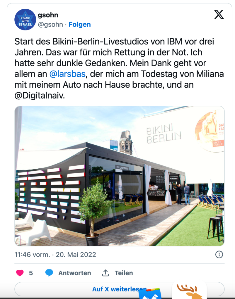 Drei Jahre ist es nun her, dass ich das IBM Livestudio während der ThinkAtIBM im Bikini in Berlin maßgeblich mitgestalten durfte. Drei Jahre ist es her, dass Gunnar, Lars und ich im Motel One in Berlin saßen und Gunnar die schreckliche Nachricht vom Tod seiner Frau bekam. Er konnte sich dann durch die Mitarbeit am Livestudio und tolle Reportagen etwas von seinem Verlust ablenken. Das sind Ereignisse im Leben, die man nicht vergisst. Danke an alle, die auch mir in der Zeit durch herausragendes Teaming geholfen haben. Leider haben einige oberkluge Social Media-Strategen in Armonk den deutschen YouTube-Kanal gelöscht, auf dem viele interessante und wertvolle Reportagen gespeichert waren.