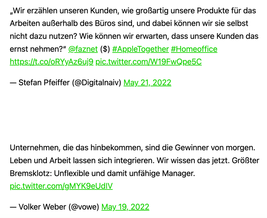 Das Thema wird über kurz oder lang auch auf mich zukommen, denn Chefs sehen Mitarbeiterinnen und Mitarbeiter lieber im Büro, auch wenn das inhaltlich oft Unsinn ist. Ich glaube an ein hybrides Modell, wie ich ja auch bei #9vor9 mit Lars gesagt habe. Präsenzmeetings machen Sinn, aber ins Büro kommen und dann doch nur an Videokonferenzen teilnehmen ist einfach nur Mumpitz.