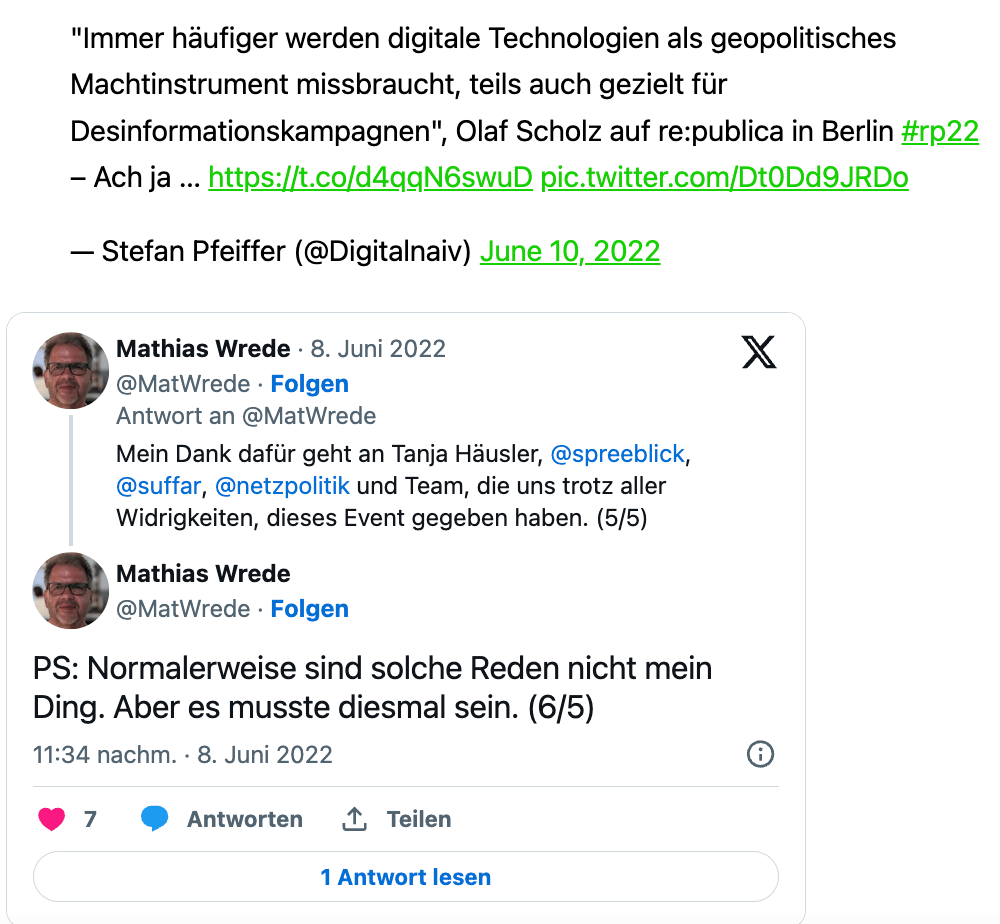 Aus Vorsicht habe ich an re:publica, die endlich wieder stattgefunden hat, nicht teilgenommen, obwohl es meine Lieblingsveranstaltung ist Klar, da gibt es viele spannende Vorträge. Noch wichtiger war es für mich aber, alte Bekannte zu treffen und neuen Menschen vor allem aus der Digitalszene kennen zu lernen. Deshalb habe ich die Tweets und Tröts auf Mastodon immer mit einem Auge verfolgt. Hier nun drei Beiträge: Eine Einschätzung des Events von Jörg Schieb, ein süffisantes Zitat zum nicht unbedingt gelungenen Auftritt von Kanzler Olaf Scholz und ein Dank an die Organisatoren und ihr Team. Ich hoffe, dass Lars Basche, der natürlich wie viele andere da war, am Dienstag bei #9vor9 über seine Eindrücke berichtet.