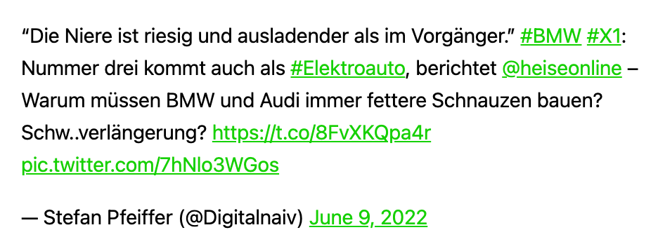 Zwei Veranstaltungen stehen im Fokus meines Wochenrückblicks: die re:publica in Berlin und die Apple-Entwicklerkonferenz WWDC 2022. Daneben wieder vielfältige Themen, die mich beschäftigt haben, wie die dicken Nieren von BMW, der Kampf gegen Kippen oder den Hype um den neuen Gladbacher Trainer Daniel Farke.