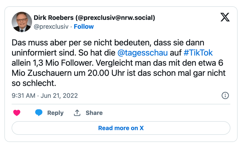 …, denn beispielsweise TikTok spielt als Nachrichtenplattform eine immer größere Rolle. Laut dem Reuters Digital News Report hat sich die Nutzung von TikTok für Nachrichten bei den 18- bis 24-Jährigen in nur drei Jahren auf 15 Prozent verfünffacht. Das muss aber nicht heißen, dass die Jungen nicht gut informiert sind, meint der Dirk. Das Thema TikTok werde ich mir auf jeden Fall die Tage im FAZ Digitec Podcast auf die Ohren geben.