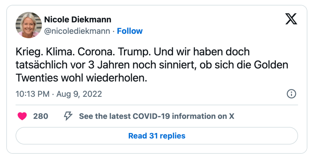 Meine Wochenrückblick: Beginnen möchte ich mit einem Zitat von Nicole Diekmann. Mit dem Klimawandel konnte man vielleicht rechnen, mit dem Ukraine-Krieg, der Pandemie und Trump wohl eher nicht. Mal schauen, was bei der Hausdurchsuchung bei Besagtem heraus kommt …