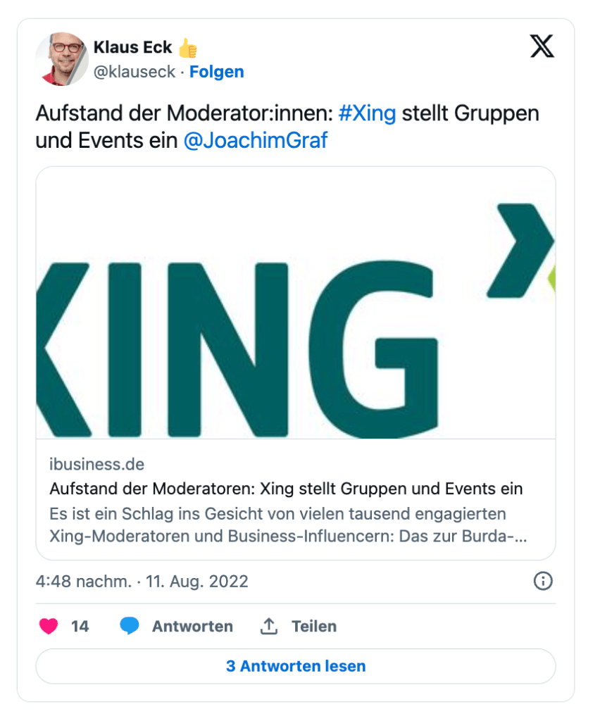 Die Jungen werden Xing kaum kennen. Für uns Ältere war es lange Jahre die Business Plattform, bevor dann LinkedIn immer mehr Erfolg auch in Deutschland hatte. Auf Xing hat man sich in Gruppen ausgetauscht und seine Angebote mehr oder weniger clever promotet. Dort wurden Events promotet. Damit ist jetzt Schluss. Die Gruppenmoderatoren regen sich auf, doch wie aktiv waren die Gruppendiskussionen noch? New Work SE – so heißt Xing unterdessen – setzt wohl darauf, dass die Plattform als Jobbörse überleben kann. Lars Basche und ich werden es am 16.9 bei #9vor9 diskutieren.
