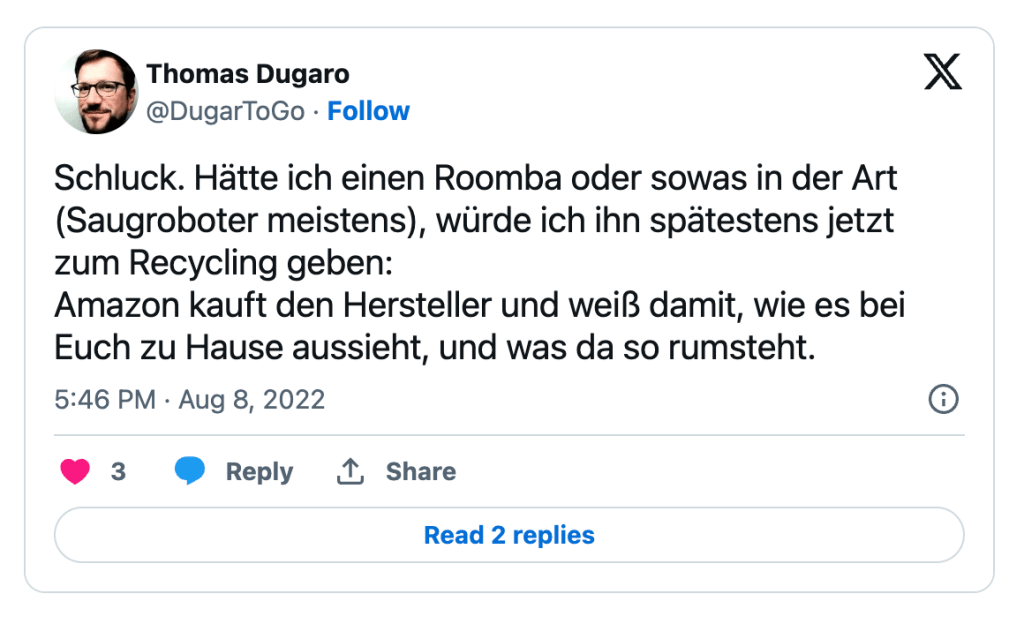 Und ich höre sie wieder sagen: Ich habe doch nichts zu verbergen. Wenn Ihr das glaubt, dann nutzt Alexa und auch die Roomba-Saugroboter. Ein Schwarzmaler und ewiger Pessimist, wer Böses dabei denkt.
