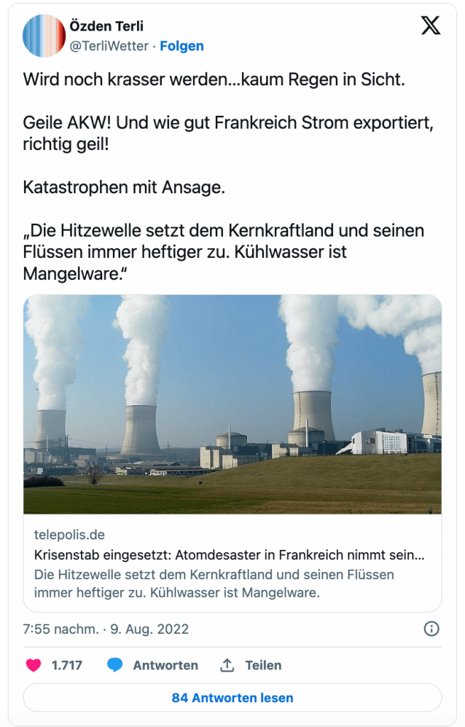 Gerade jetzt kommen wir um einen Blick auf das Klima und die Energieversorgung nicht herum. Wie man ernsthaft wieder auf Atomenergie setzen kann und will, bleibt mir nicht nur mit Blick auf Frankreich ein Rätsel.