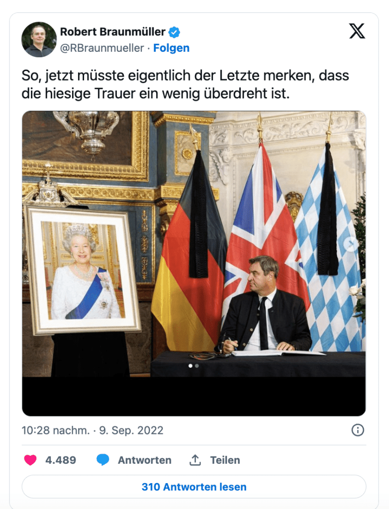 Die Queen ist gestorben. Mit stolzen 96 Jahren. R.i.P. Und jetzt sollten Herr Söder und Konsorten es auch mal gut sein lassen.