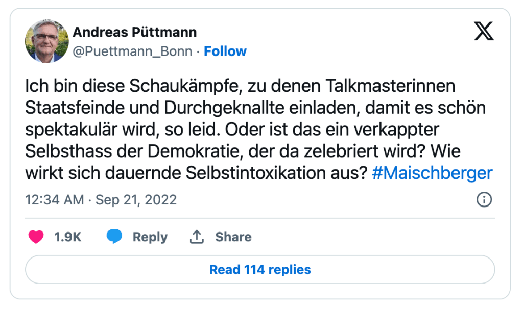 Ich war mal ein Freund von Talkshows, wenn dort interessante und intelligente Menschen aufgetreten sind. Jetzt nerven viele der Talkshows, weil viele – wie Andreas Püttmann es schreibt – Durchgeknallte immer wieder eingeladen werden. Krawall scheint Einschaltquoten zu generieren und das ist wohl die primäre Motivation.