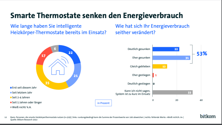 An dieser Stelle sei auch auf die Studie des Bitkom verwiesen, bei denen auch die Zufriedenheit mit smarten Thermostaten abgefragt wurde. 90 Prozent der Befragten empfehlen die Geräte, etwas mehr als die Hälfte der Befragten gehen von gesunkenem Energieverbrauch aus, was angesichts der Kostenexplosion sicherlich ein wichtiges Argument ist.