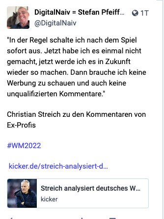 Zum Abschluss des Wochenrückblicks zwei „Soft-Nachrichten“ zur WM und zur Weihnachtszeit. Einmal Michael Kausch zum Weihnachtsmann und ein Zitat von einem der letzten verbliebenen Sympathieträger des deutschen Fußballs. Christian Streich laut Kicker: „In der Regel schalte ich nach dem Spiel sofort aus. Jetzt habe ich es einmal nicht gemacht, jetzt werde ich es in Zukunft wieder so machen. Dann brauche ich keine Werbung zu schauen und auch keine unqualifizierten Kommentare.“